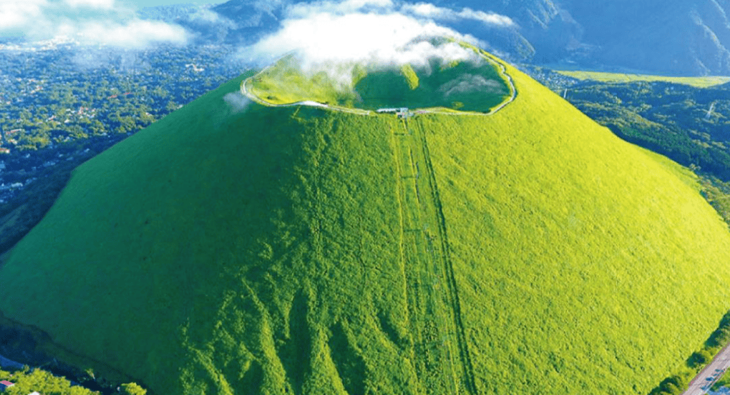 大室山海拔580公尺,可搭乘空中纜車登上火山口眺望360度絕美風景。登頂後別忘了在火山口散步,近距離感受火山地形的神奇。