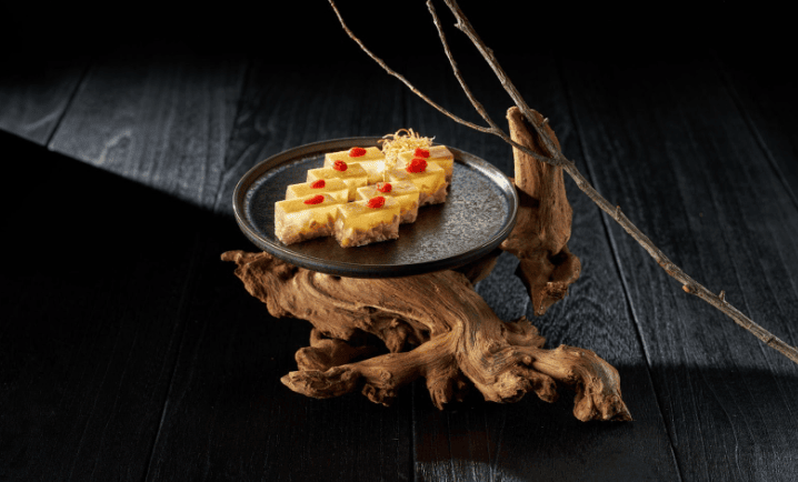 這道榮獲銀賞的創新組合包含四種小點:首先是絲瓜去囊後用麻油爆香蛋酥一起炒香,包入紅龜粿蒸製;第二道則是芋頭切絲鋪底,放上三杯猴頭菇蒸製入味;第三道以麻油炒百菇後包進菠菜汁麵皮內;最後一道則運用薑汁跟牛奶的凝結,創造出溫潤香甜的創新甜品。四款小福各有特色,組成完整的味覺體驗。