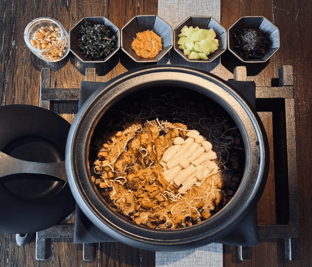 先用麻油爆香蔥末與香菇末,加松阪肉片炒出香氣備用。另起鍋用醬油和高湯調味,倒入麻油增香,依序放鴻喜菇和柳松菇小火慢煨。接著倒白飯慢火燉煮,讓米粒充分吸收湯汁精華。煮至錦潤飽滿時拌入蒜苗與芹菜,鋪上金黃松阪豬片,撒紅潤枸杞點綴,色香味俱全層次豐富!每一口都能感受到溫暖、濃郁、多層次的美妙滋味!