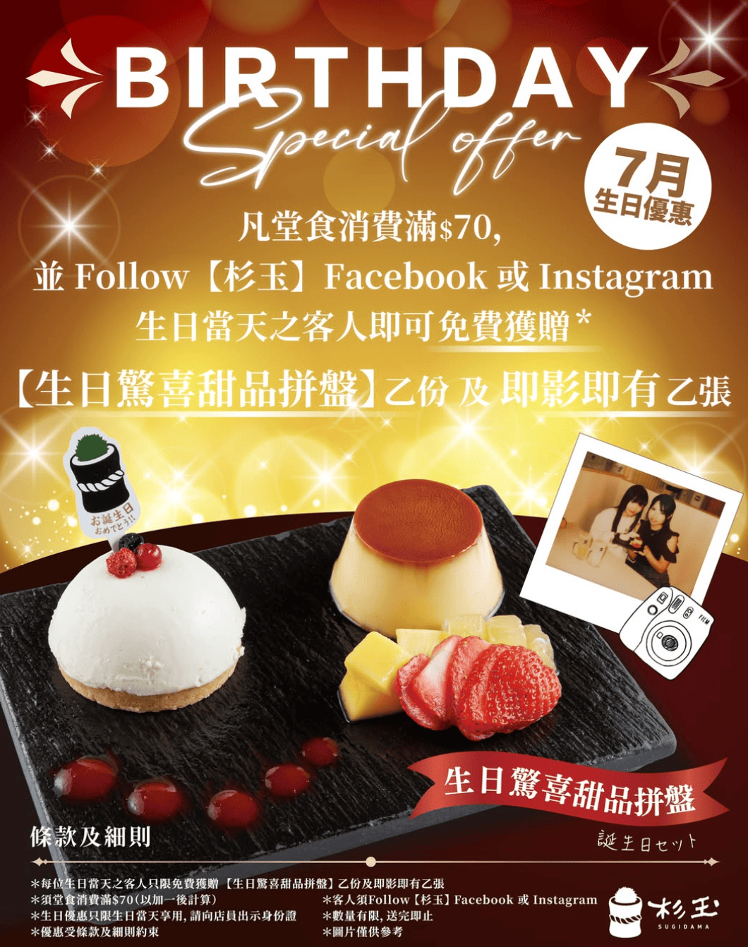 壽司郎旗下居酒屋「杉玉SUGIDAMA」在7月為壽星們準備了特別的生日驚喜!只要您在生日當天到任何一間分店消費滿HK$70 (已含加一服務費),並追蹤杉玉的Facebook或Instagram官方帳號,即可免費獲贈一份生日驚喜甜品拼盤和一張即影即有照片!