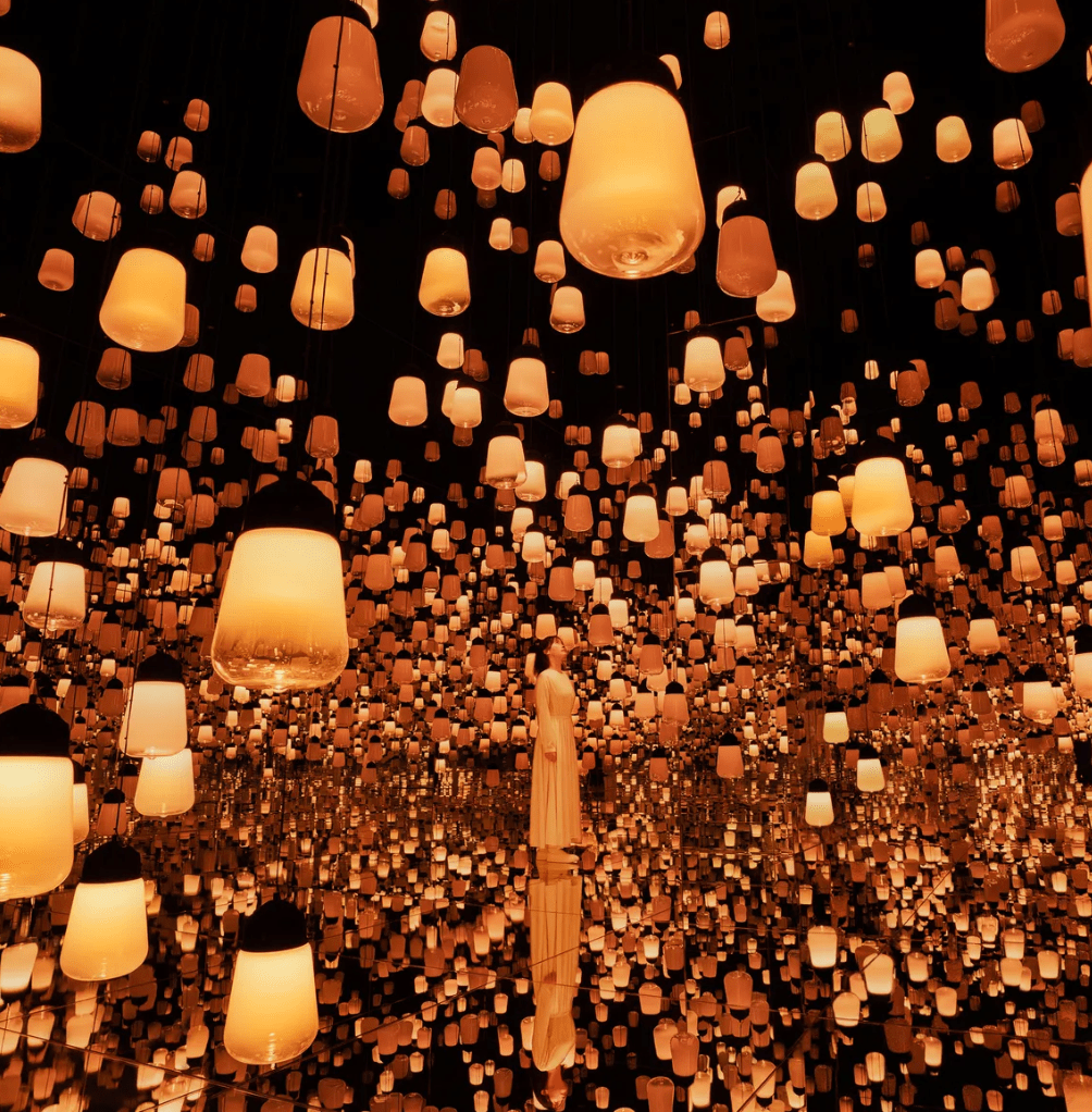 當你踏入展區時,會發現這裡沒有明確的邊界~光點在四周流動,空間彷彿延伸至無盡的遠方。這種設計帶來了一種奇妙的感受,彷彿自己也成為了這個永恆流動的一部分。